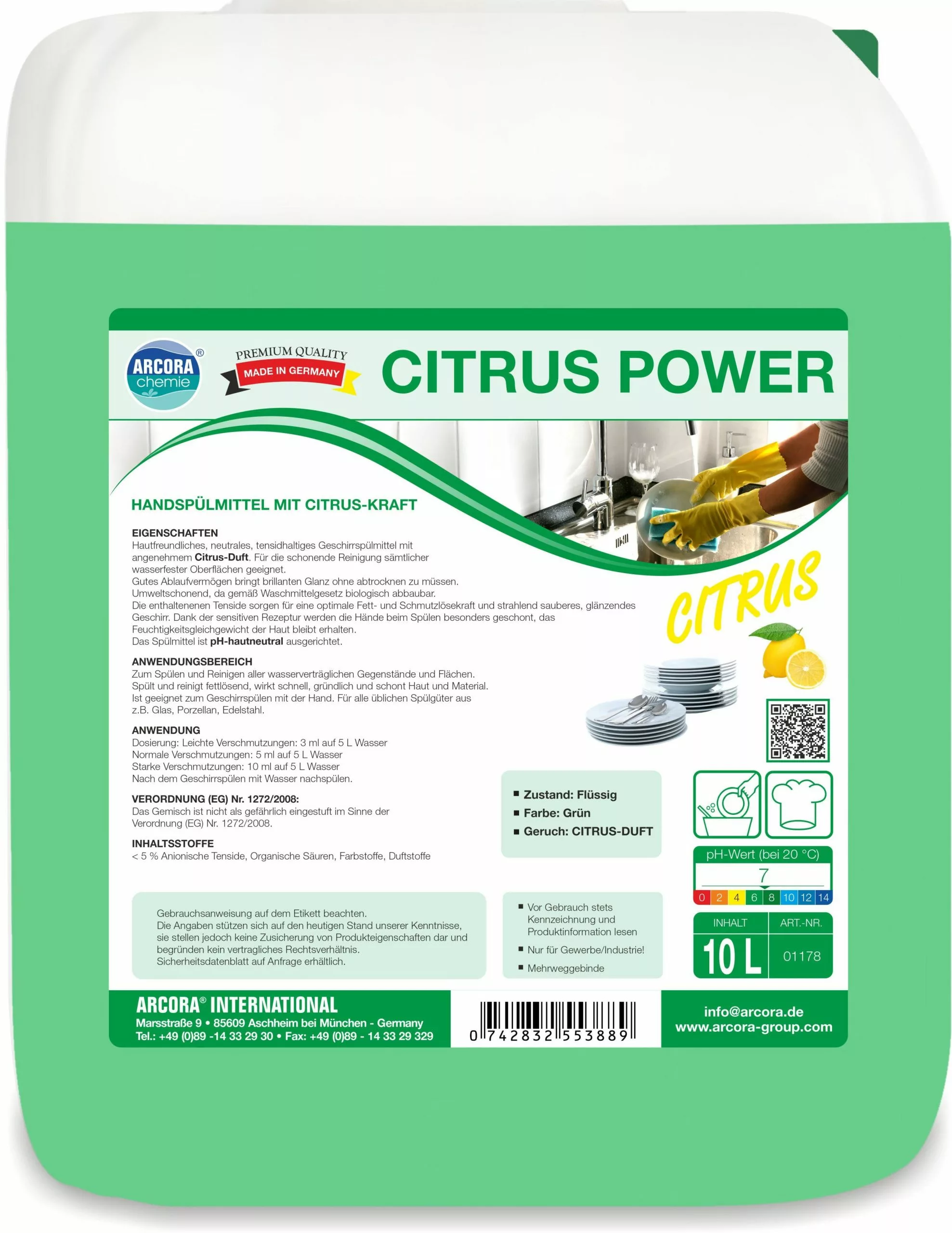 Hautfreundliches, neutrales, tensidhaltiges Geschirrspülmittel mit angenehmen Citrus-Duft