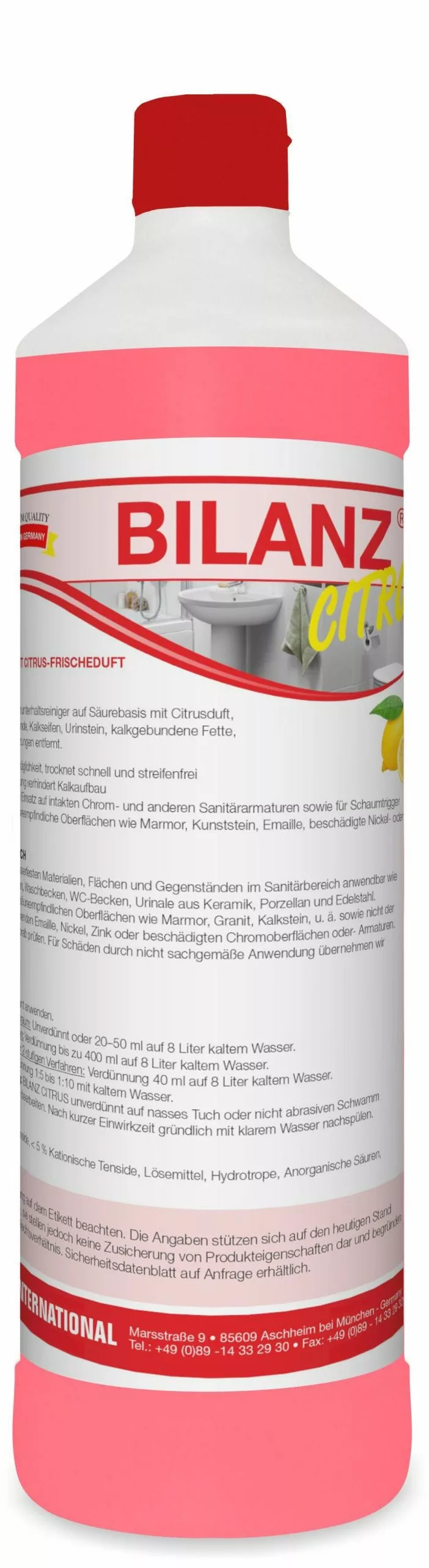 Schnell wirkender Sanitärunterhaltsreiniger auf Säurebasis mit Citrusduft, der mühelos Kalkrückstände, Kalkseifen, Urinstein, kalkgebundene Fette, Rost und Fettverschmutzungen entfernt.