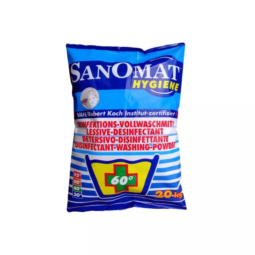 Das Sanomat Hygiene-Desinfektionswaschmittel ist ein leistungsfähiges Vollwaschmittel ab 30 °C und ein hochwirksames Hygienewaschmittel zur chemo-thermischen Wäschedesinfektion ab 60 °C. Sanomat Hygiene ist geeignet für alle waschbaren Textilien und Wäschearten ausgenommen Wolle und Seide. Beste Waschkraft, Desinfektion, eine optimale Fleckenentfernung und wirksam gegen MRSA, HI Virus, Noroviren (bei Beachtung der bestätigten Konzentration und Einwirkzeiten von VAH und RKI bzw. Hygieneplan) ab 60 °C.