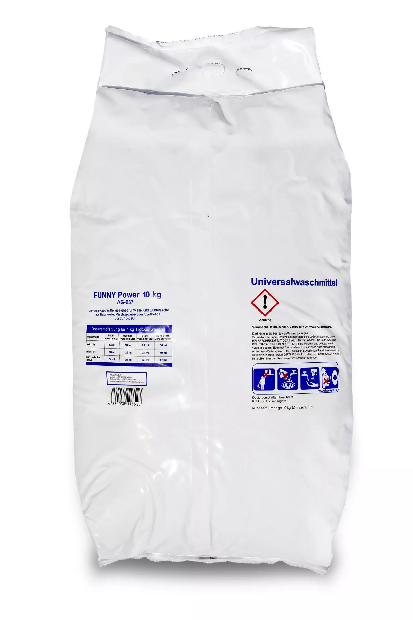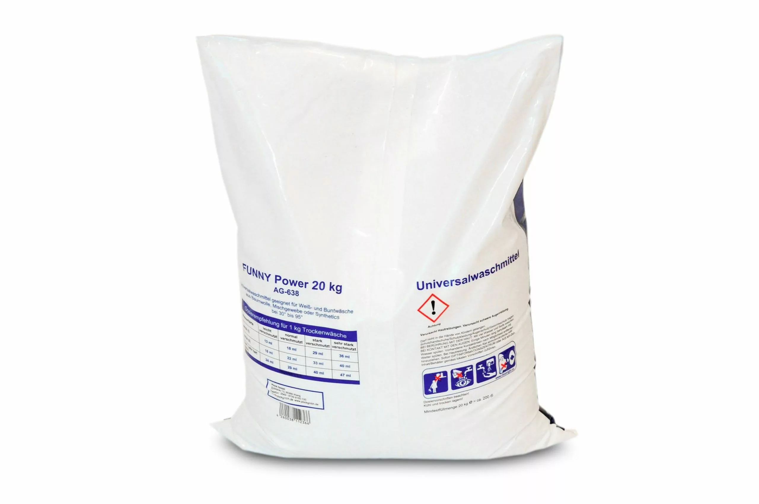 Das Vollwaschmittel AG-638 von Funny ist ein ergiebiges Universalwaschmittel für den professionellen Gebrauch. Das Universalwaschmittel ist für alle Wasch-Temperaturen (30 – 95 °C) geeignet und wäscht die Wäsche zuverlässig und rein. Verwenden Sie das Voll-Waschmittel für alle Arten von Wäsche. Das Waschmittel wird ohne Phosphate und allergene Stoffe hergestellt. Abnehmer sind Wäschereien, Reinigungsunternehmen sowie Gastronomie & Hotellerie. Der 20 kg Sack (VE) ist aus einem stabilen und wasserdichten Kunststoffsack, so dass Sie diesen gut lagern können.