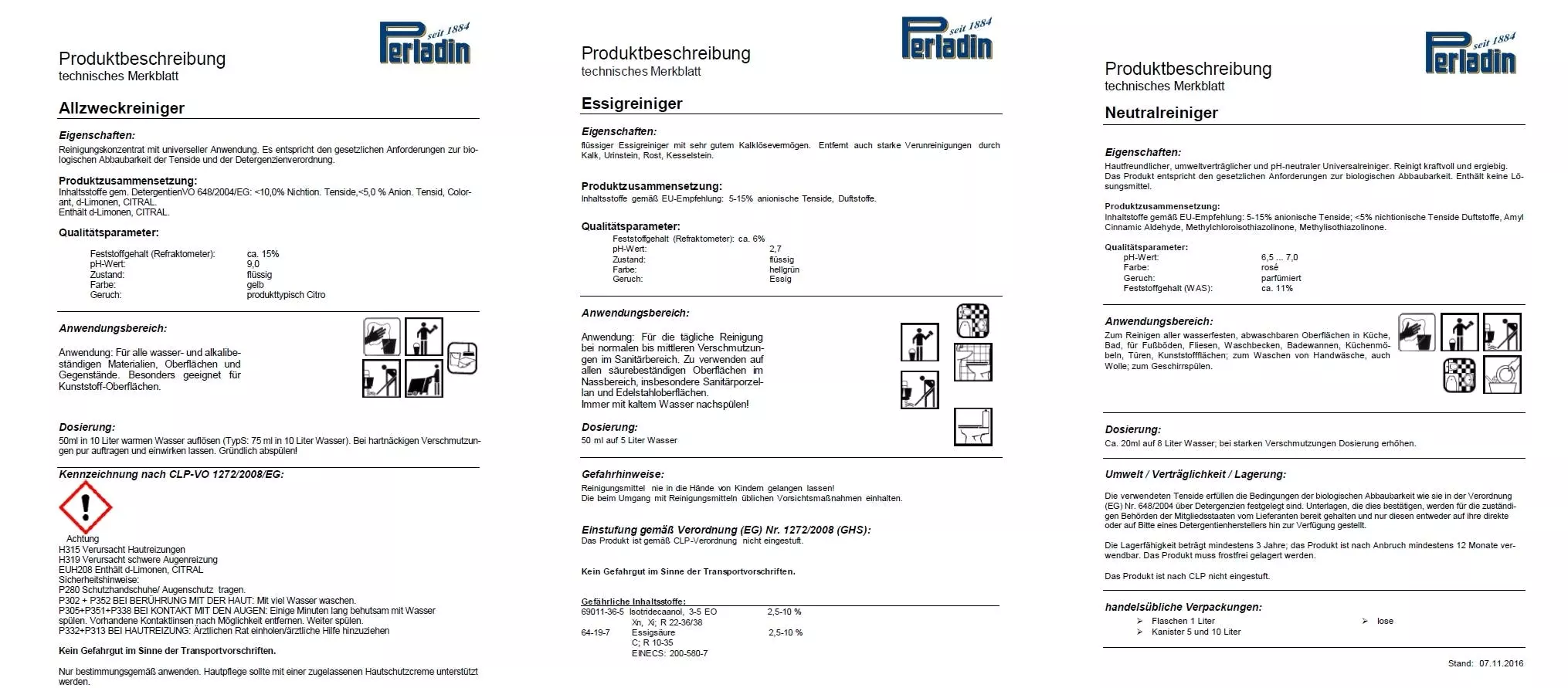 Durch seine pH-neutrale Einstellung ist er besonders schonend zu allen Oberflächen, aber auch zur Haut, die mit der Reinigungslösung in Kontakt kommt. – Perladin Universal/Allzweckreiniger ist der ideale Schonreiniger für Haushalt und Gewerbe, löst starken Schmutz, bringt Sauberkeit und Frische,