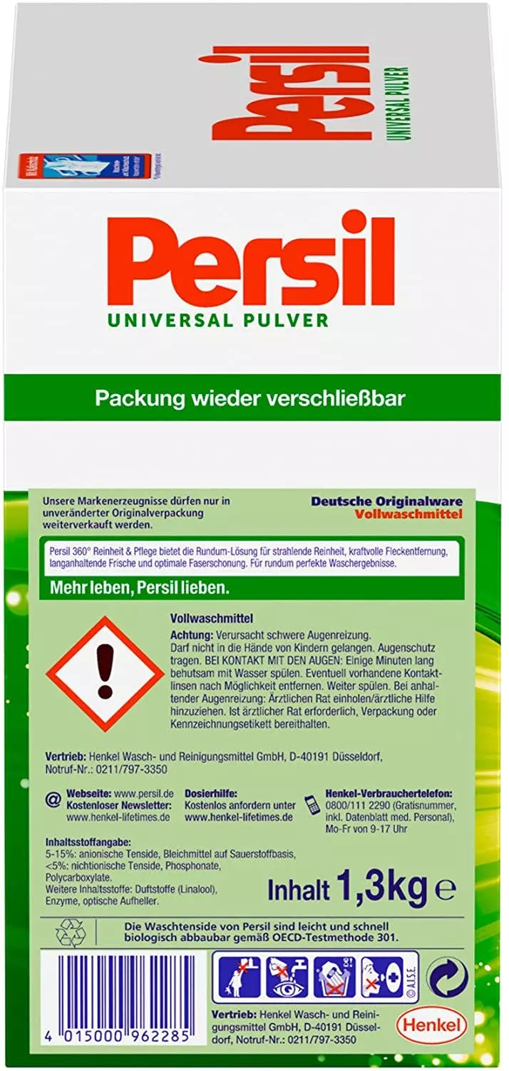 Persil Universal Pulver ist der Klassiker von Persil für strahlend reine Wäsche. Dank der Tiefenrein-Technologie, bekämpft Persil auch hartnäckigste Flecken. Es dringt tief in die Fasern ein und entfernt sogar kleinste Fleckenmoleküle. Gleichzeitig schützt es die Fasern vor Flusenbildung und bietet die bewährte Frische von Persil. Dank der innovativen Formel bleibt weiße Wäsche auch nach häufigem Waschen strahlend rein und bietet eine langanhaltende angenehme Frische.