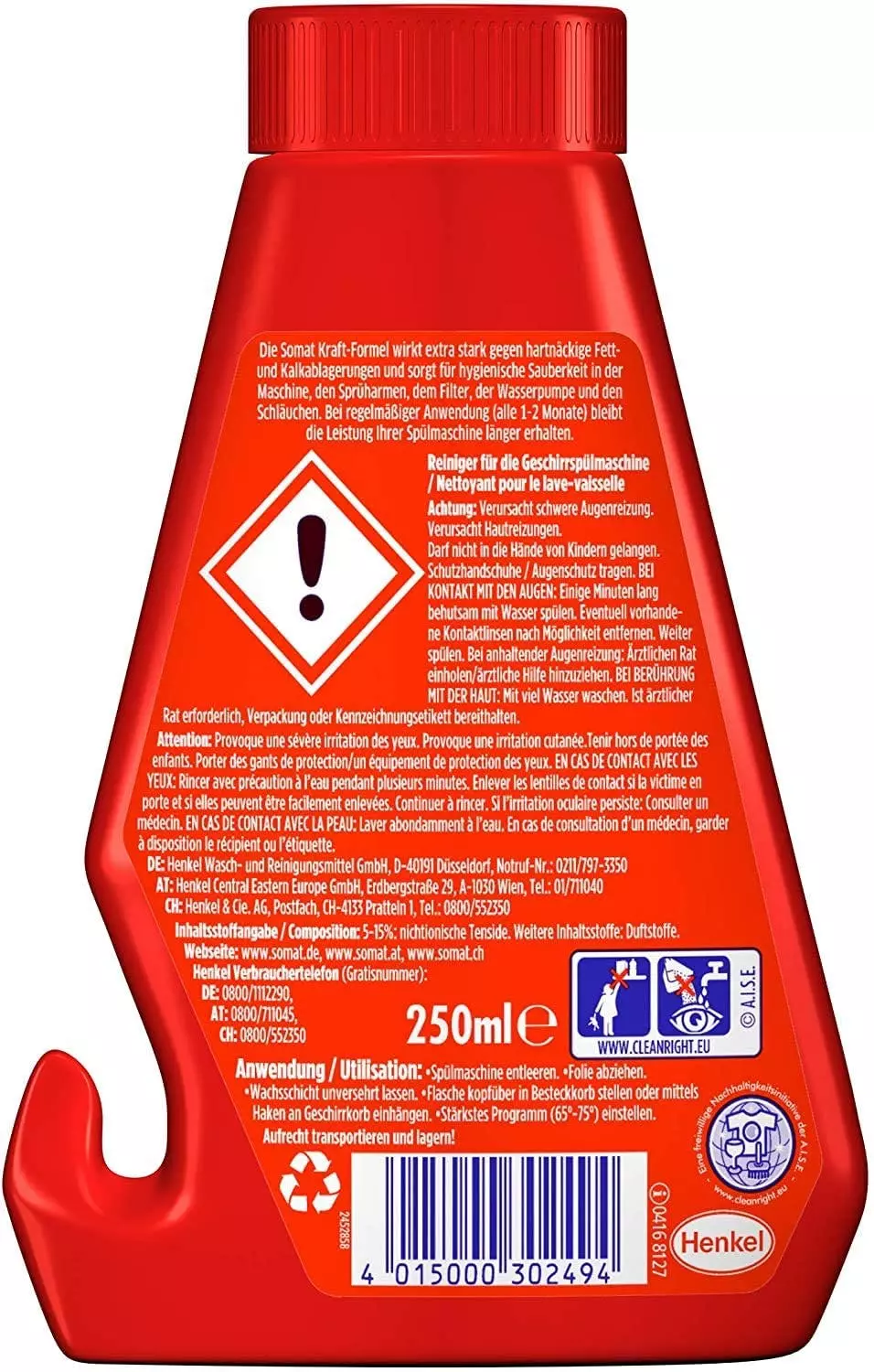 Somat Maschinenreiniger für Geschirrspülmaschinen entfernt Fett und Kalk pflegt Maschine, Sprüharme und Filter Lieferumfang: 1 Flasche mit 250 ml Produktkennzeichnung und Warnhinweise: ACHTUNG Einstufung und Kennzeichnung gemäß Richtlinie 1272/2008/EC. Gefahrenhinweise: H315 Verursacht Hautreizungen.H319 Verursacht schwere Augenreizung. Sicherheitshinweise: P101 Ist ärztlicher Rat erforderlich, Verpackung oder Kennzeichnungsetikett bereithalten. P102 Darf nicht in die Hände von Kindern gelangen.P280 Schutzhandschuhe/Augenschutz tragen.P302+P352 BEI BERUÃàHRUNG MIT DER HAUT: Mit viel Wasser waschen. P305+P351+P338 BEI KONTAKT MIT DEN AUGEN: Einige Minuten lang behutsam mit Wasser spülen. Eventuell vorhandene Kontaktlinsen nach Möglichkeit entfernen. Weiter spülen. P337+P313 Bei anhaltender Augenreizung: Ärztlichen Rat einholen/ärztliche Hilfe hinzuziehen.
